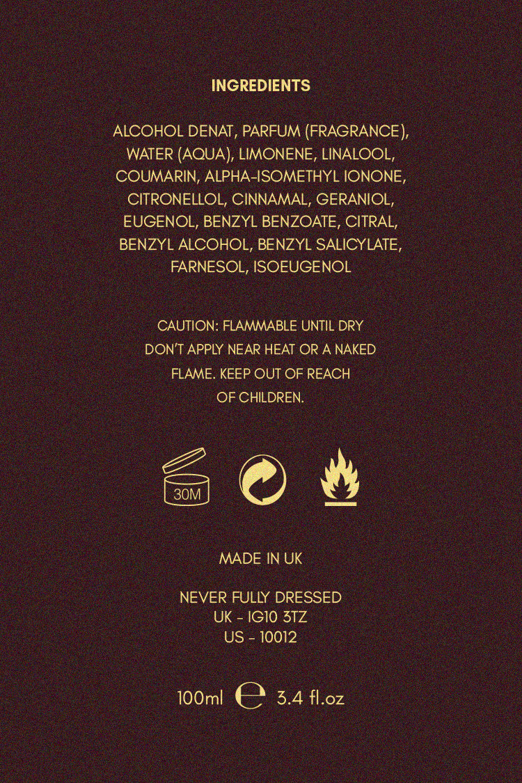 Alcohol Denat, Parfum (Fragrance), Water (Aqua), Limonene, Linalool, Coumarin, alpha-Isomethyl ionone, Citronellol, Cinnamal, Geraniol, Eugenol, Benzyl benzoate, Citral, Benzyl alcohol, Benzyl salicylate, Farnesol, Isoeugenol